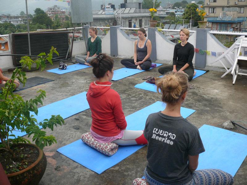 Rishi Poudel, owner of Peace Eye Guest House Invites all guest to join his free morning Yoga class on the rooftop overlooking the splendid Annapurna Mountain Range.