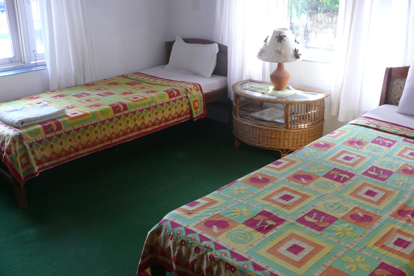 These rooms have all the comforts of the Standard Double except they share a communal bathroom. All rooms open onto an outside veranda. Two double beds per room.